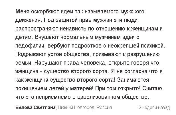 Следует отдать должное автору самой петиции. В кои-то веки женщиной проведена работа по сбору информации, подготовке ссылок, формированию последовательного текста с логическими переходами, – обычно ведь дело ограничивается словесно-текстовой истерикой с узким спектром характерных женских штампов. Но и тут без штампа не обошлось, – надёжного такого, сугубо феминистического штампа, который всегда транслируется на всех мужчин, – педофилия. Остальные женщины его с лёгкостью подхватили и выразили по этому поводу свою единодушную и принципиальную позицию, молодцы. Никто не удосужился вникнуть в суть идей МД, да и зачем, когда всё «правильно» объяснила доминантная самка, проделавшая такую колоссальную, по женским меркам, работу, – вон, сколько ссылок, весь текст от них красный. Ну, а доминантной самке остальные всегда подражают, чтобы оказаться в зоне солидарности, подтвердив её звуками, жестами и словами. Рассмотрим некоторые комментарии, – они воистину шедевральны и симптоматичны.