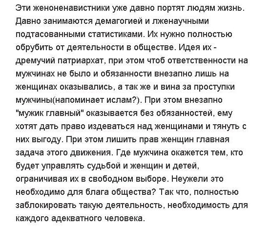 А лично меня, Светочка, оскорбляет женская безаппеляционность, которую вы лишний раз демонстрируете в своём замечательном комментарии. Кстати, ненависть по отношению к женщинам формируете вы сами своим специфическим поведением, а нам лишь остаётся констатировать этот печальный факт. Я, как представитель Мужского Движения, так много узнал о себе от вас, проницательная вы наша. Оказывается, с ваших слов, что я внушаю ненависть к детям, вербую подростков, подрываю устои общества, призываю к разрушению семьи. Мне бы впору гордиться такими талантами влияния на окружающих, жаль только… у меня их нет, увы. А вот то, что у меня есть, относится к объективным данным женского поведения в семье , которые вы сами не стесняетесь обнародовать на весь интернет, например, здесь . Что же касается женской второсортности, тут Светочке вообще не стоит волноваться, она, безусловно, – первый сорт для «цивелизованного» матриархального общества.