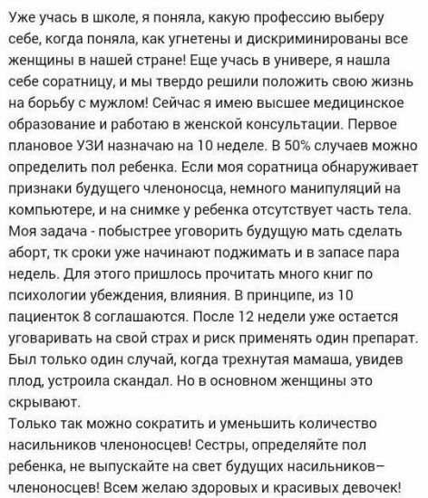 Как тут не согласиться с Кристиной! – действительно нельзя пропагандировать ненависть по половому признаку. А то ведь с экрана дебилизора с утра до ночи в ток-шоу, рекламе и даже новостях мужчину снисходительно преподносят эдаким гротескным, туповатым и никчёмным осликом, не способным и шагу ступить без своей умнейшей повелительницы, которую он должен безропотно обслуживать всё свою жизнь, считая себя при этом вечно виноватым. Кстати, кто-нибудь пробовал делать с женщиной «всё, что в голову придёт»? Уверен, что альфа-бабуины не просто пробовали, но и делали, под радостные и одобрительные визги участниц. А вот остальным – не советую. В цивилизованных странах за это – срок нешуточный. Посмотрел с вожделением – судебное разбирательство, не посмотрел и потому обделил вниманием – судебное разбирательство, писаешь стоя – дискриминируешь женщин, стульчак не поднял – смерть тебе, с подвешиванием за яйца и последующей кастрацией, педофил проклятый. Девочка Катя в следующем комментарии всецело разделяет позицию передовых стран: