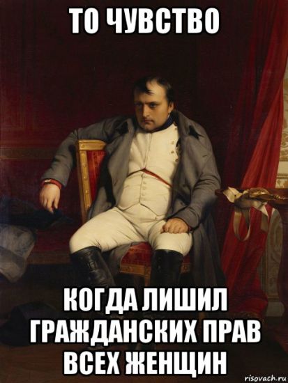 В статье «Феминизм» в Википедии, написанной феминистками и ежедневно по несколько раз проверяющейся ими (не переписал ли кто их версию мира) есть интересное утверждение: «в 1804 году император Наполеон издал указ, объявлявший, что женщина не имеет никаких гражданских прав и находится под опекой у мужчины». Такой произвол, конечно же, вызывает гнев праведный у всех сторонников равноправия, а копипаст этой цитаты растиражирован на бесчисленном количестве феминистских и других сайтов.